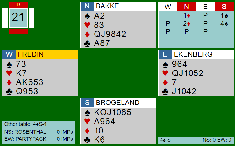Det kan kanskje se ut som om ruterfargen kan utnyttes, men det går ikke. Spillefører får imidlertid hjem utgangen så snart han får stjålet en hjerter hos nord så det blir til sammen syv trumfstikk og tre toppstikk i sidefargene. Som du ser i venstre hjørne nederst står det 4S, -1 bak "other table". HVorfor det?