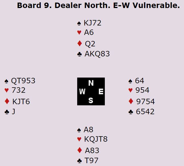 Ved de fleste bord åpnet syd aktuelt med 1 hjerter, og der var gjerne nord med til 4 hjerter. Men det skjedde også at øst-vest meldte seg uforstyrret opp i utgang i spar etter at syd noe overraskende valgte å passe i første melderunde.