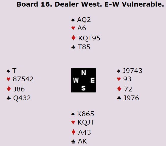 Seks av 20 N/S par meldte 7NT og noterte +1520, og to par var i utgang! Resten hadde +1020 for 6NT med tretten stikk bortsett fra det norske N/S paret som også var i 6NT, men doblet! Hvordan enten vest eller øst kunne finne på å doble 6NT er veldig uklart. Det ble selvsagt 13 stikk der og, og det ga den sjeldne scoren +1330. Norge vant 13 IMP på spillet siden Nederlands N/S-par var ett av de to som kom seg bare i utgang.