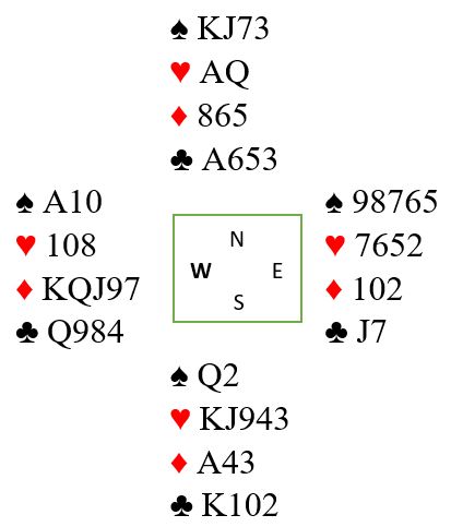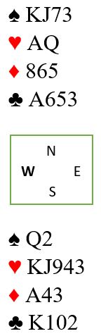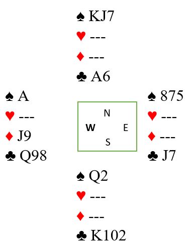 Hvis en tenker på at vest nesten helt sikkert har spar ess bør man se for seg at vest vil komme i trøbbel om han også har kløverholdet, enten QJx, eller firekorts kløverfarge så øst ikke kan hjelpe til med å stoppe fargen. Han får rett og slett for mye å passe på. Spillefører bør derfor vente med å spille spar og kjøre i gang med hjerterfargen. Etter de tre rundene med ruter og de fem hjerterstikkene blir det fem kort igjen, og da ser det slik ut: