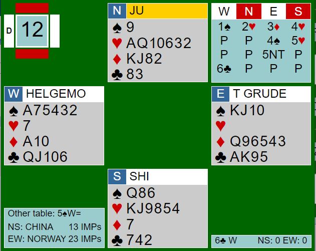 Du ser meldingene, og da Grude bestemte seg for å forsøke slem etter at de egentlig hadde kommet til å stoppe i 4 spar sa han 5NT - pick a slam. Med esset tynt sjette i spar sa Helgemo 6 kløver. Der er det bra sjanser, men med for eksempel hjerter ut må nok sparen tippes. Nord spilte imidlertid ut ruter, og da forsvant forsvarets stikk i den fargen. Da ble det ganske greit i kløverslemmen siden trumfen satt 3-2. Helgemo tok like godt alle stikkene, og +940 var verd 10 IMP siden Kina spilte utgang i sparkontrakt.