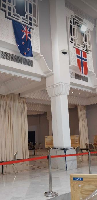 I spillelokalene henger deltakerlandenes flagg, og her "mine" to lands flagg ved siden av hverandre