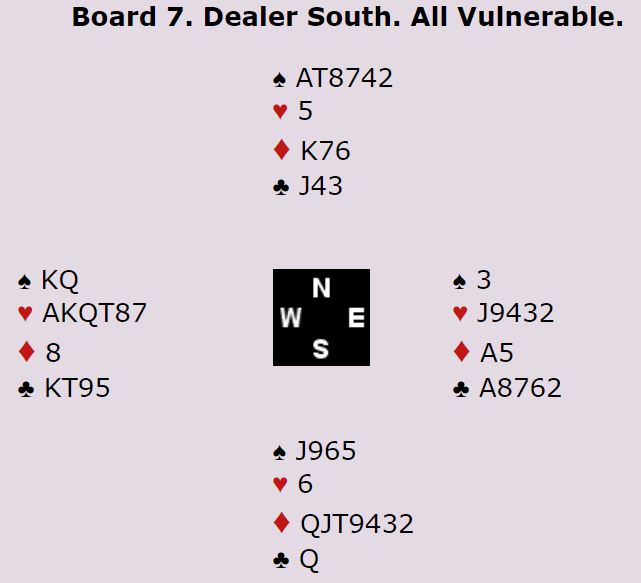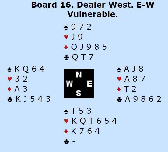 Med den trumfsitsen ble det en bet i 6 kløver og Sveits vant spillet med 12 IMP. Dermed vant de også kampen med 12,29 - 7,71 VP. Om kløveren sitter 2-1, eller alle de tre uteværende trumfene er hos syd står 6 kløver og det blir 13 IMP i favør NZ, 25 IMP i sving! Det utgjør hele 6,6 VP, dvs. NZ ville vunnet kampen mot gullfavorittene 14.39 -5,61 i stedet.