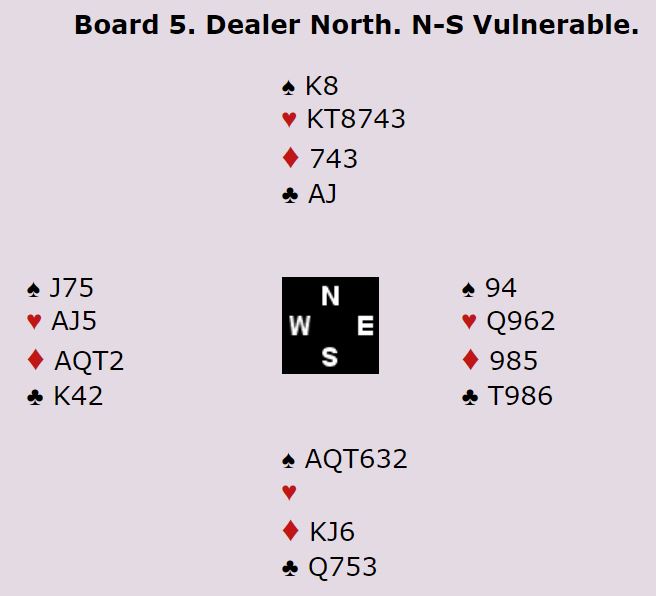 Bakke (nord) åpnet med 2 hjerter som for dem er en konstruktiv melding, maksimum er en liten åpningshånd. Brogeland hoppet til 3 spar som jeg tror er invitt. Jeg antar Bakke ville løftet til 4 spar, men da vest følte seg robbet og doblet sa nord pass. Og det gjorde øst også!