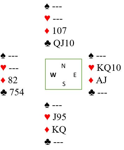 Syd kan ikke holde annerledes. Han må jo holde tre hjertere, og da blir det plass til kun K-Q i ruter. Et merkelig spill, syd blir skviset og deretter innspilt selv om han sitter bak begge truslene i rødfargene.