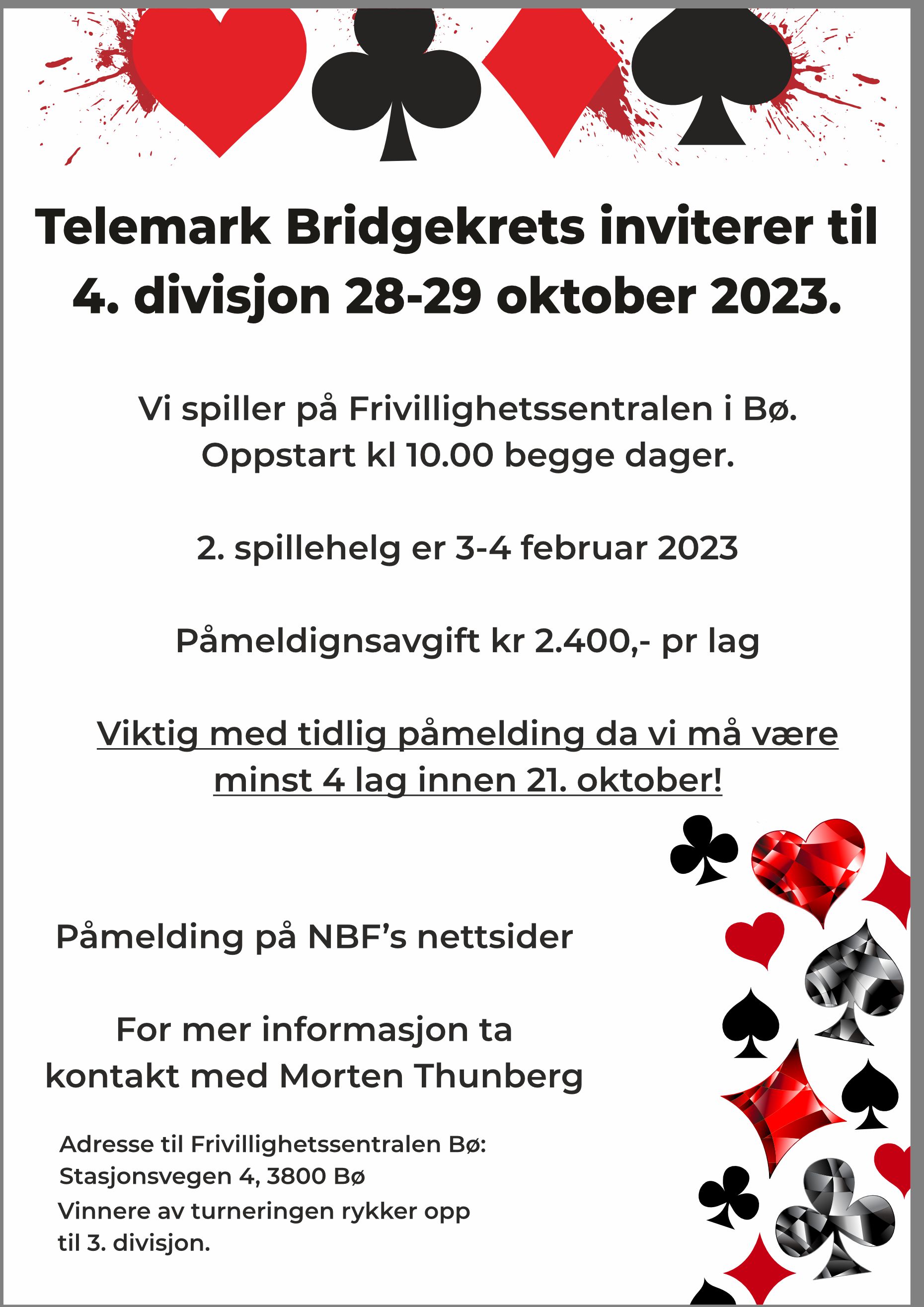 Da er vi igang igjen med 4. divisjon. Den avholdes 28-29 oktober (påmelding 21.) Dette er en turnering som egner seg spesielt for de som ikke spiller så mye. Man kan sammenlikne nivået som en vanlig klubbkveld, så det passer også veldig godt for de ferske. Notodden BK dekker påmeldingen, så det er bare å samle 4 personer og danne et lag!