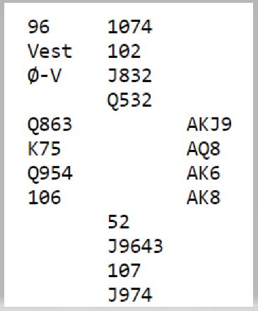 Selv om øst ikke skifter til ruter etter det fjerde sparstikket får han en sjanse til idet han er inne på kløver ess. Likevel føk 1NT hjem med syv stikk ved seks av de 14 bordene. Kun to Ø/V-par, inkludert mitt gikk en bet, -100. Det ga likevel ca. 30% da noen få Ø/V-par hadde vunnet delkontrakter i spar og hjerter.