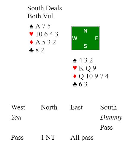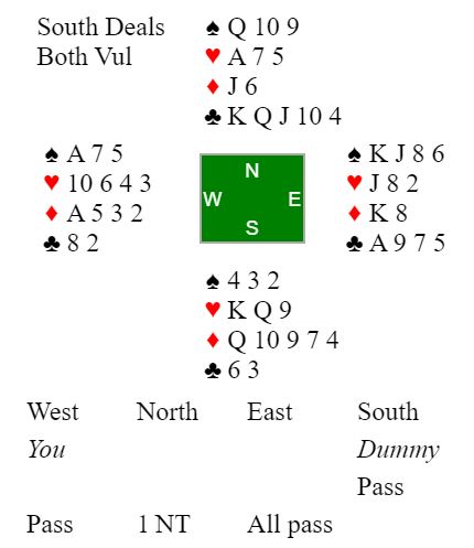 Nord er spillefører i 1NT etter å ha åpnet med en 13-15 NT (noen steder gikk det 1 kløver fra nord, 1 ruter fra syd og 1NT fra nord som 12-14).