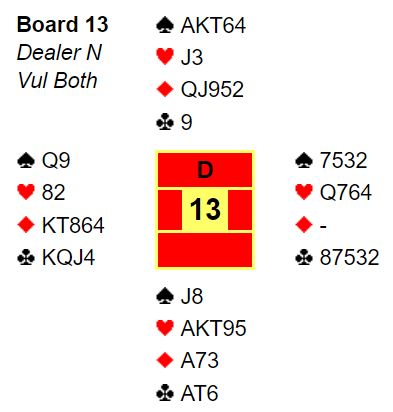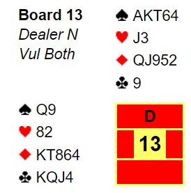 Vest halvsov imidlertid og lå unna med ruter konge, uvisst av hvilken grunn da det er vanskelig å se hva motspillerne kan tjene på det. Og vest kunne som sagt tatt beten og visste egentlig det og om hun hadde fulgt med. Etter ruter dame vant stikket tok spillefører direkte finesse i hjerter med knekten la løpe og kunne gjenta den finessen for fem hjerterstikk så han noterte til slutt elleve stikk.
