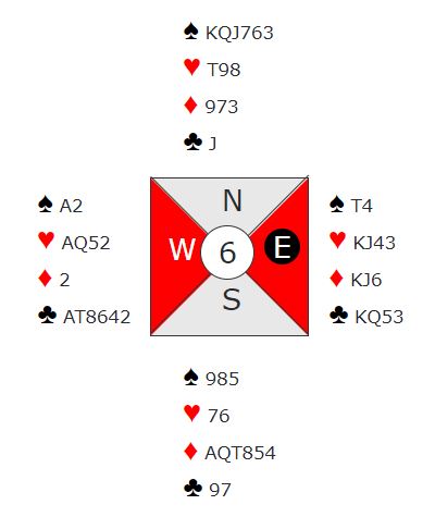 Det står i 6 hjerter. Om det kommer spar i utspill må riktignok trumfen sitte 3-2. Da kan trumfen tas ut i kun i tre runder, og kløverfargen gir avkast for østs andre spar. Vests lille spar kan deretter trumfes med østs siste trumf, og vests hånd står bortsett fra den ene ruteren. Om hjerter hadde vært fordelt 4-1 ville det ikke gått bra, da ville det blitt bet etter sparutspill.