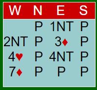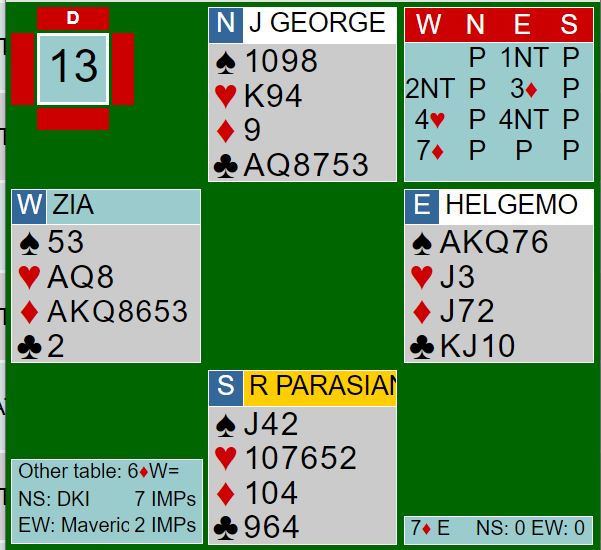 Dette er en fin lilleslem. Kun noen veldig få par var kun i utgang, resten i lilleslem, foruten ved det bordet der Zia spratt i 7 ruter over 4NT.