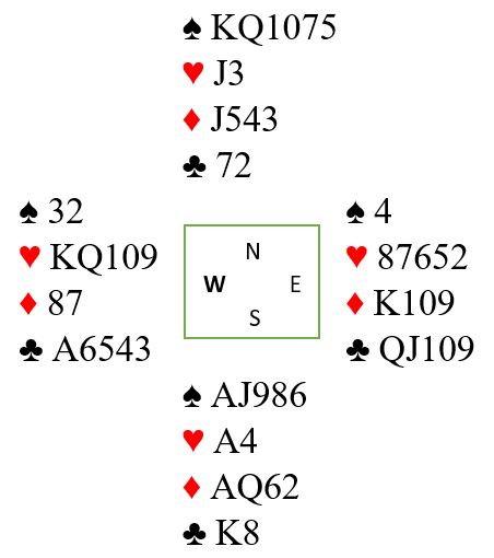 Riktig spilleplan her er å stikke med hjerter ess i første stikk, så prøve sjansene i tur og orden. Muligheten for kun en kløvertaper fordi esset sitter foran bør om nødvendig prøves til slutt. Om øst har kløver ess sitter det der mot slutten også.