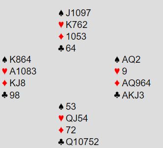 Ø/V har ikke utgang, og de har heller ikke styrke nok det. Egentlig gjorde Edgtton-Whibley det på en måte bra som som Ø/V ved det andre bordet da de stoppet lavt i 1NT. Syd doblet imidlertid opplysende der også, men Edgtton (vest) gikk ikke for en straffedoblings-situasjon ved å redoble. De spilte altså 1NT som Ø/V og fikk syv stikk, +90. Det kostet 12 IMP.