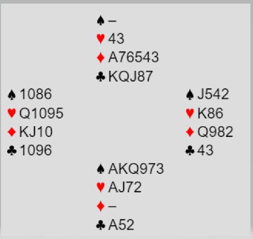Det ble enkelt tretten stikk etter trumfutspill fra øst. Da fikk spillefører med seg 5-2 i spar også ved å stjele et par rutere og stjele to spar på hånden, deretter ta ut trumfen og hente sparstikkene med hjerter ess som inntak. Det satt jo 4-3 i spar så det var aldri noe stort problem etter trumfutspillet. Om det kommer hjerter ut blir det litt verre fordi hjerter ess blir revet bort. Da kan ikke sparfargen stjeles god å hentes med tre ganger trumf, for trumfen blir eneste inntak om hjerter ess må brukes i første stikk. Fem sparstikk kan fås, men det gir kun 5+1+1+5= 12 stikk. Løsningen om det kommer hjerter ut er å ikke satse på godspilling av sparen, men spille på kryss-stjeling. Etter hjerter ess tas A-K-Q i spar med ett hjerteravkast og to ruteravkast. Så hjerter til stjeling, ruter ess og ruter til stjeling. En hjerter til stjeles med kløver 8, og da det går bra i det stikket er det bare å krysse resten med høye trumf. Dette gir fem trumfstikk hos nord og tre hos syd, med andre ord åtte trumfstikk som sammen med A-K-Q i spar og to røde ess gir tretten stikk i alt.