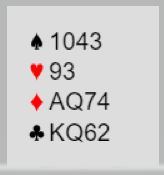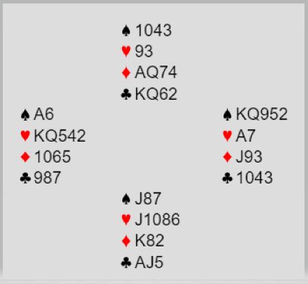 Hva betyr 4NT i en slik poss? Ikke for spill, denne gangen. 4NT her vil si at melderen har to alternative farger å spille, minst 5-5. Det kan være ruter og kløver, eller hjerter og ruter. Syd må derfor velge å støtte "nedenfra", og heller bli korrigert oppover. Her bør syd melde av kløveren sin, som et forslag hvis nord har kløver og ruter. Denne gangen blir han korrigert til ruter, fordi kortene satt som følger: