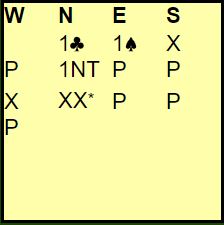 Som i spillet her i bloggen forleden (fra samme kamp) er det mange som i den situasjonen har avtale om at 1NT fra åpneren ikke lover stopper i spar, for noe må jo åpneren melde. Da 1NT ble doblet fikk nok nord litt kalde føtter og redoblet som han mente som SOS. Men syd hadde så bra kort at han trodde dette kunne stå: