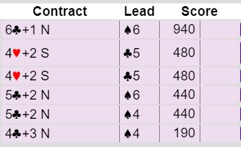 Dette er på ingen måte et spill hvor det kan eller bør meldes storeslem selv om den er nedlegg! Lilleslem er som regel mer enn godt nok med 26 HP til sammen og denne typen kort. Og det var nok i denne kampen, for Bogø-Sivertsvik var det eneste paret som fant frem til lilleslem! Ett par var sogar i delkontrakt, men det var nok etter en kjempeblunder av nord som passet på 4 kløver etter at syd tidligere hadde brukt fjerde farge krav. Resultatene ved de seks bordene var slik: