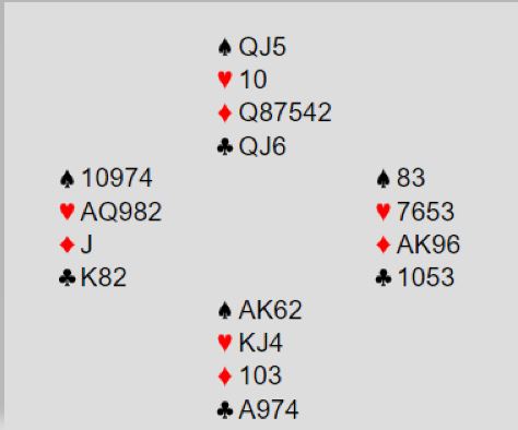 På Gressvik BK mandag ble det spilt handycap- turnering, og Arne Marthinussen og meg slet med -3 hver runde og da må man ha fleks for å ende høyt oppe, men det hadde vi. Astrid og Hans Lindberg ledet ganske klart før siste runde, men da møtte de oss og var uhelig da de ble presset med en tartan 2 NT (svak/ begge minor) fra Arne om giver i spill 26 der alle var i faresonen.