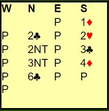 Syds 4 ruter er beskrivende. Syd kunne hatt omtrent samme antall HP men en dårligere hånd en disse kompakte verdiene. Ofte vil kanskje syd ha en kløverhonnør tredje når han går på en gang til, men dette er ikke langt unna perfekte kort for syds meldinger. Nord stolte på makkeren og avsluttet med 6 kløver - en praktisk og god melding etter min mening.