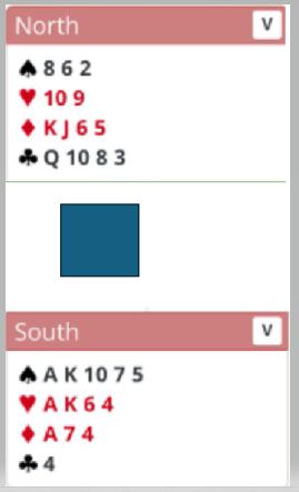 Det er neppe noen hundre prosents vinnervariant her, men en tanke er å få trumfet begge de små hjerterne. I fjerde runde hjerter vil en av de kunne trumfe og vinne det stikket, men det kan jo godt være han må trumfe med trumflengden. I så fall blir det kun en trumftaper siden fargen så er fordelt 2-2. Og skulle det bli to trumftapere på den måten har du ruterfinessen i reserve.