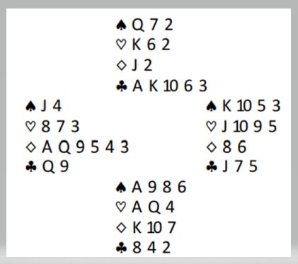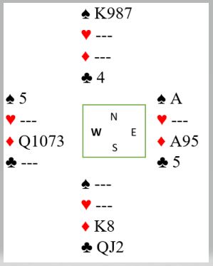 En kan tenke slik: Hvis kløver sitter 4-4 kan ruteren godspilles, syd er storfavoritt til å ha kongen. I så fall blir det kun tre kløverstikk og ett ruterstikk til N/S. Men kløveren så unektelig ut som den satt 5-3, og da blir det automatisk bet om de får komme inn.
