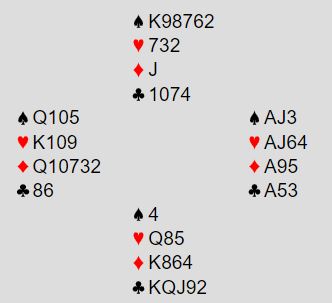 Jeg satset derfor på å få tak i stikkene som trengtes i majorfargene og tok hjerterfinesse med nieren som holdt. Så sparfinesse, nords eventuelle 3-4 HP var trolig i den fargen. Og da sparfinessen holdt var det ni stikk med tre i spar, fire i hjerter og to minor ess.