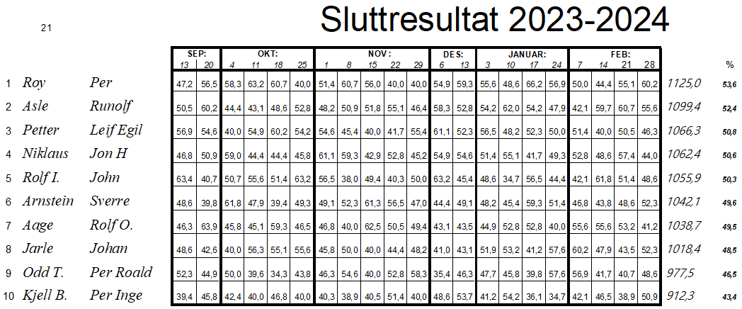 Vi spilte klubbmesterskap 6 kvelder fra og med 5. februar hvor de 5 beste resultatene telte.