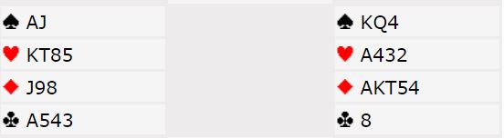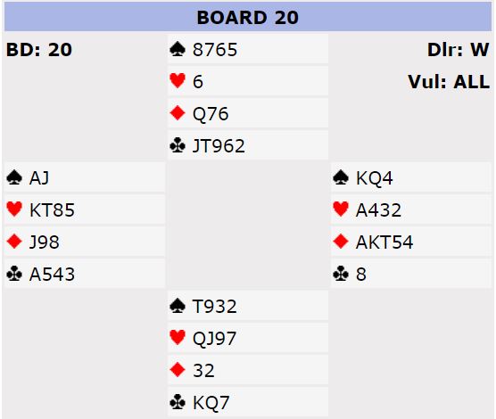 Jeg spilte hjerter ess og hjerter mot vest. På esset fulgte øst med sekseren og syd med syveren. Så hjerter mot K-10-8. Syd fulgte da på med hjerter 9. Hva er best nå? Finesse som fører til at rutefinessen må gå, eller ta kongen og håpe på 3-2 i trumf og godspille ruteren med stjeling. Etter lang betenking til meg å være gikk jeg opp med kongen, men dessverre med lang nese som resultat: