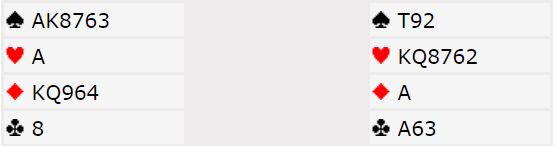 Det ser nesten ut som det ikke behøves noen spilleplan her, 6 spar ser ganske nedlegg ut. Det blir tretten stikk om trumfen sitter 2-2. Men hva om nord har alle de uteværende trumfene? Det er i utgangspunktet en veldig liten sjanse for det når vi har en farge med ni kort til sammen, men litt mer sannsynlig i denne konteksten hvor syd har vist en veldig lang kløverfarge.