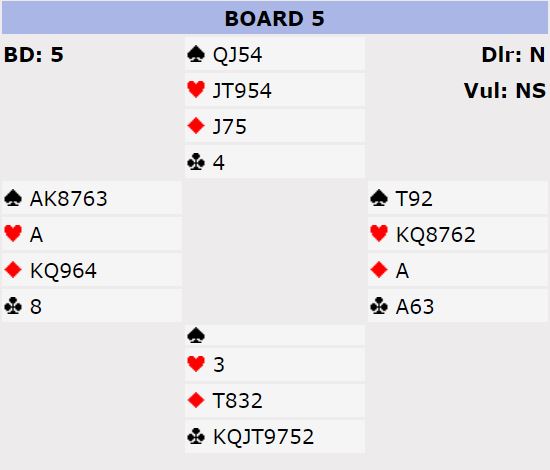 Av 28 Ø/V-par i A-puljen var to par i storeslem som måtte gå bet. Det var 11 par som var i 6 spar, og to av dem fikk den hjem. Ellers var det mange utganger i spar og noen få kløverkontrakter på fem-trinnet. Doblet ga 5 kløver -800 eller -1100 alt etter motspillet. Å spille 5 kløver doblet med Ø/V +800 ga hele 12 IMP til Ø/V i denne turneringsformen, selv om Ø/V altså kan få tak +980. Eller i teorien har Ø/V tolv stikk i sparkontrakt hvor å melde slem ikke er unaturlig. Men de N/S-parene som gikk bet i 5 kløver doblet måtte bare innse at teori og praksis er ikke alltid det samme...