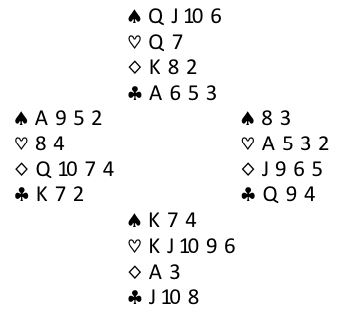 Ruter ess vant altså første stikk, og det ble spilt hjerter. Øst lå unna med hjerter esset og stakk senere før han fortsatte med ruter. Spillefører kom inn igjen og prøvde spar dame. Men vest lå unna, og da var syds hånd en øde ørken! Det fulgte spar til kongen i håp om spar ess hos øst, men vest stakk med spar ess og tok to ruterstikk. Forsvaret hadde fire stikk og vest spilte seg fri med spar til bordet. Spillefører måtte til slutt spille kløver fra bordet og tapte to stikk i den fargen. To bet, og han måtte altså måtte følge på med hjerterstikkene sine mot slutten. Bortspill!