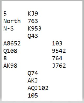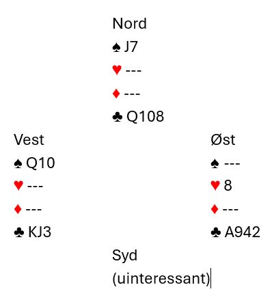 På hjerter 8 må spillefører kaste en kløver fra vest. Men nord som er alene om kløverholdet pga. lengden i fargen må enten gå ned på to kløvere – da står østs kløver – eller gi opp sparholdet.