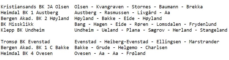 Det er et jevnt og godt felt. For meg peker de de to lagene fra Bergen Akademiske seg ut som favoritter sammen med Heimdal 1 som vel er en likeverdig gullkandidat. Hvis jeg må tippe så vil mitt tips til vinnerlag være Bergen Akademiske 1 (C Bakke).