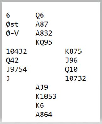 Etter sparutspillet var det "bare" å løse kløveren og gi bort ett hjerterstikk så ble det 3+3+2+4= 12 stikk. Pluss 990 ga ren topp til N/S. Ett par vant 6 kløver og fikk nest topp, men å vinne tolv stikk i 3NT ga pent pluss det også, +8 av 19 oppnåelige.