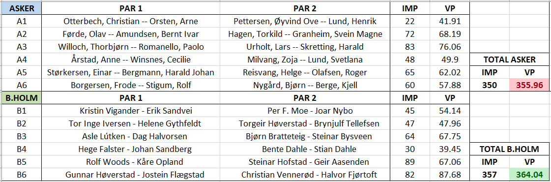 Roar Jacobsen og Øystein Brakalsvålet stakk av med seieren i kveld. De vant klart med 61,11 % foran Rune Løvås og Per Ivar Finbråten på 56,25 %.