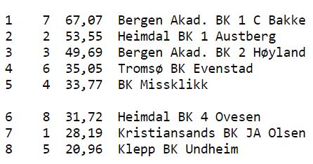 Etter tre og en halv kamp av totalt syv kamper leder fortsatt Bergen Akademiske BK - Bakke. Lederlaget har fått en luke på 13,5 VP til Heimdal BK 1 - Austberg på 2.plass. Det skal imidlertid ikke mye til for at en sånn ledelse blir innhentet, et tap til lederlaget og seier til nr. 2, og det er jevnt. Bergen AK 2 - Høyland følger på 3.plass nesten 14 VP bak nr. 2, og de igjen har fått en luke (14,6VP) ned til fjerdeplassen.