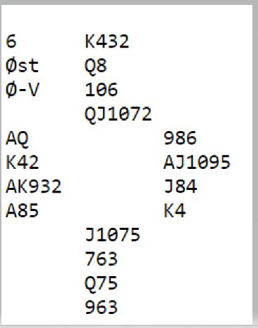 Kun ett par til i feltet meldte og vant 6 hjerter, Jan Arild Olsen - Helge Stornes. Alle de andre Ø/V-parene stoppet i utgang med elleve eller tolv stikk.