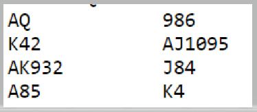 Røren så safespillingen, esset fulgt av liten mot knekten. Om nord har dame-10 fjerde går dette fint, og om syd har det og nord ikke følger farge i andre ruterrunde legges knekten som syd stikker, så kan tieren dobbel gjenværende fiskes opp med en markert finesse. Og sitter det 3-2 spiller det ingen rolle hva en gjør, det blir fire ruterstikk ved å spille slik og 1+5+4+2 = 12 totalt.