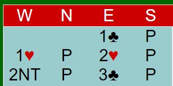 Så langt har øst fortalt at han har kun trekorts hjerter og samtidig at han har femkorts kløver og neppe en helt jevn hånd da med det kunne han ha meldt 1NT i stedet for 2 hjerter.