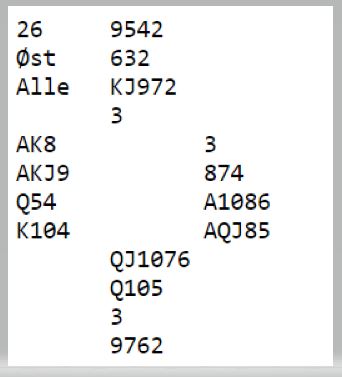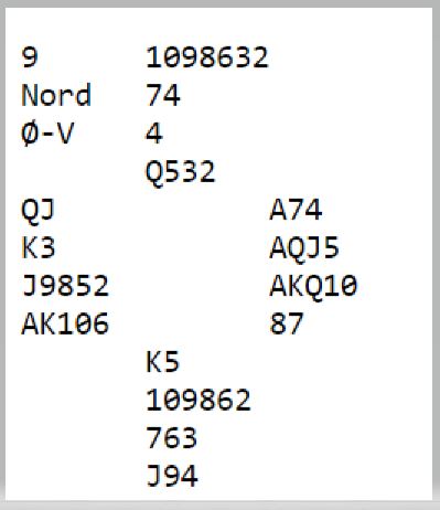 Ved det andre bordet passet nord i første hånd, og Ø/V fikk melde i fred etter 2 kløveråpning fra øst. Hoftaniska-Charlsen meldte med bra styring til 7 ruter. Siden trumfen ikke satt 4-0 var det tidlig "claim" da tre runder trumf kan tas ut før en spar og en kløver kastes på hjerteren. Vests fjerde kløver kan så trumfes med østs siste trumf. Så det ble +2140 og 13 IMP til lederlaget som trolig er norgesmestre søndag ettermiddag.