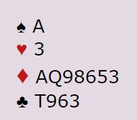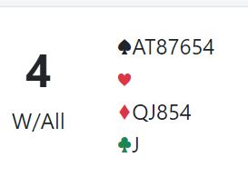 En om mulig enda verre melding ble avgitt ganske tidlig i et senere sett som hadde startet bra. Jeg satt nord med vest som giver og alle i sonen. Vest passet. Min hånd hadde 8 HP, sekskorts par, singel hjerter, fire ruter og dobbel kløver. Jeg vurderte å åpne med 3 spar, men det var i sonen, og kanskje ingen grunn til å «pushe» for mye. Så jeg åpnet med svake 2 spar. Godt å ikke ha minimum av og til...