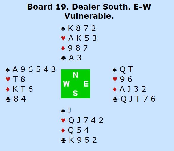 Men flaksen var i alle fall der, for jeg hadde firekorts spar også (4-4 i major) så trumfstøtte til makkers var på plass. Så kontrakten viste seg å være grei nok selv om makker fikk sjokk idet en helt annen blindemann ble lagt opp enn det han regnet med. Og 20-åringen på andre siden av bordet spilte slemmen godt, tolv stikk og +1430. Det var gevintsspill siden de stoppet i utgang ved det andre bordet.