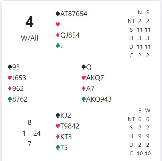Ved det andre bordet åpnet nord med 4 spar som en normal person. Syd var ikke med til 5 spar. Mine lagkamerater som var klart bedre enn oss i grunnspillet var skuffet over sin avgjørelse i dette spillet siden de frivillig meldte seg opp i 6 kløver som gikk en bet, +100. Men denne gangen ga det 14 IMP inn med resultatet fra vårt bord som vi leverte sammen med en «crazy» historie.