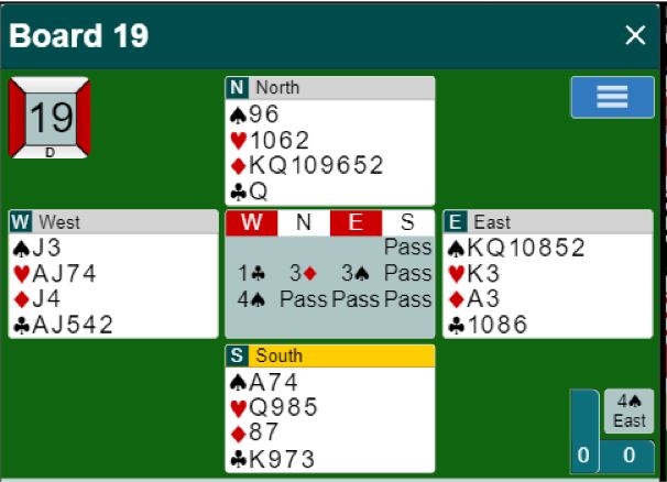 Som vi ser hjelper det ikke om Lars slipper utspillet, Ivar kommer inn på trumf ess og gir makker en stjeling, og 11 stikk er akkurat like mye topp. Ja, 6 spar står, men det vet man i etterkant.
