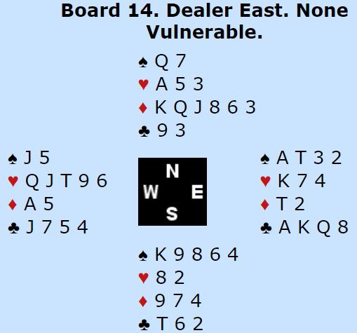 En kan se for seg at ruteren ikke var fordelt sånn som her, og om det i så fall hadde kommet et annet utspill enn ruter ville Ø/V fått seg en litt ufortjent topp i 3NT. Men her kom selvsagt ruter ut, og kontrakten kunne ikke vinnes.