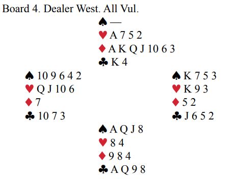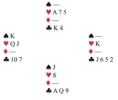 Det er opplagt at det er sannsynlig spar bør være trumffargen. Men makker kan jo ha firekorts hjerter og singel eller renons i spar. Og det kan kanskje være best i hjerterkontrakt selv om makker har kun trekorts hjerter også. Mye å ta stilling til her i tillegg til systemavtalene makkerparet har. Dessuten vil det koke ned til hvor optimistisk syd er. For det kan jo godt stå slem, kanskje til og med storeslem. Det er ikke sikkert alle fikk melde i fred heller, for slik så hele spillet ut: