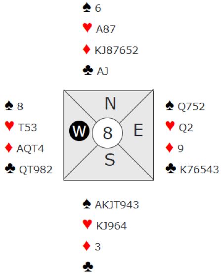 Det er nok litt for hardt i teorien når en ser N/S sine kort sammen. Men i praksis har slem litt bedre sjanse, for det er langt i fra sikkert at vest spiller ut ruter ess. I så fall forsvinner syds ruter 3 på kløver ess. Slik det sitter med snill hjertersits blir det i så fall tolv stikk med kun en spartaper i 6 spar. Om det meldes 6 hjerter kan den kontrakten vinnes selv om vest tar for ruter ess da en i hjerterkontrakt unngår spartaper. Så i hjerterkontrakt kan det bli tretten stikk om ikke vest tar ruterstikket.