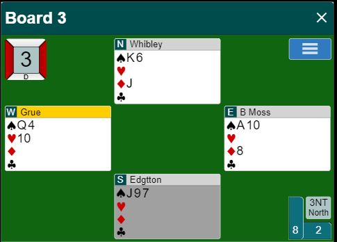 Whibley (nord) hadde vist 22-24NT, og etter syd hadde undersøkt om majortilpasning ble nord spillende 3NT. Øst spilte ut ruter 9 (lover tieren, kan ha høyere honnør, men ikke knekten) til syds konge.