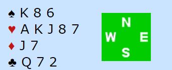 Denne hånden har noen dårlige verdier. En ugardert dame tynt tredje er minus og J-7 i ruter er heller ikke så bra. På den annen side er det en veldig god hjerterfarge. Hva synes du, åpning med 1NT eller 1 hjerter?