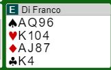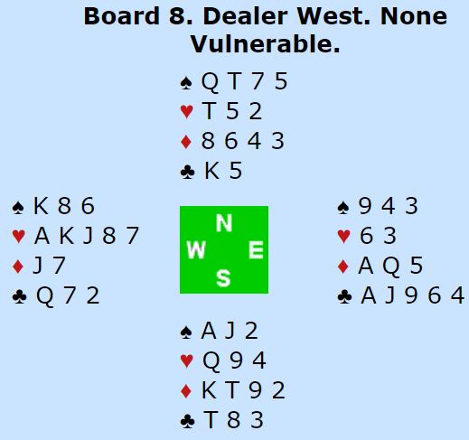 Her var Duboin og Cima (N/S) brutale. Mot vests 4 spar doblet spilte nord ut hjerter ess fulgt av hjerter dame til kongen, og syd stjal. Fra syd kom ruter til stjeling hos nord, så kløver til syds ess og nok en ruter til stjeling. Det var allerede to doblede, og slik det så ut måtte fortsatt syd få for ruter konge, den tredje beten, N/S +500.